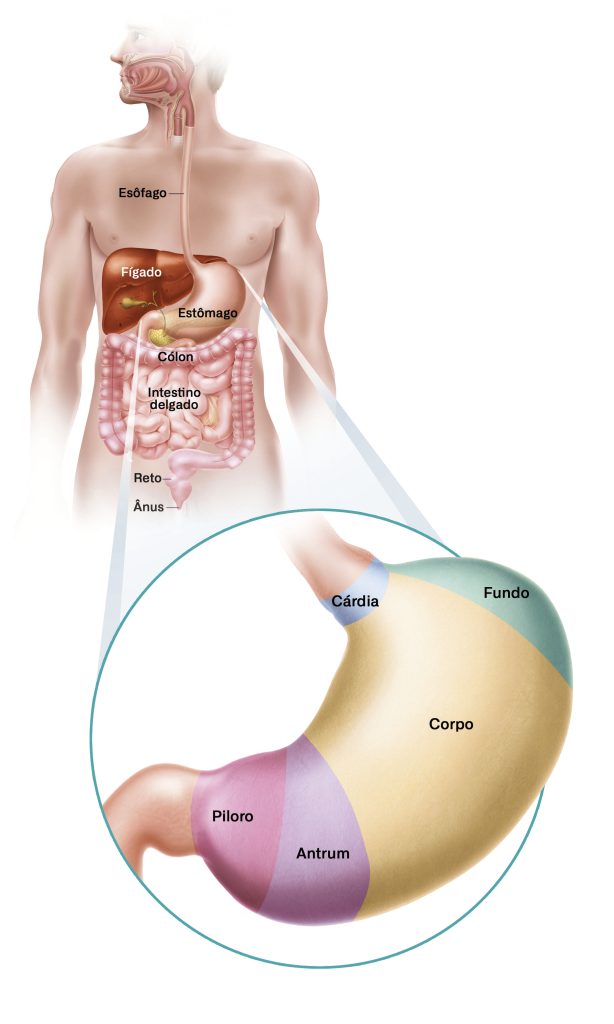 O estômago é um órgão muscular, no formato de uma bolsa, que se situa na parte superior do abdômen e é essencial para a nossa digestão. Após a ingestão, os alimentos passam pelo esôfago, um tubo oco, até chegarem no estômago, onde se misturam aos sucos gástricos, iniciando o processo digestivo.