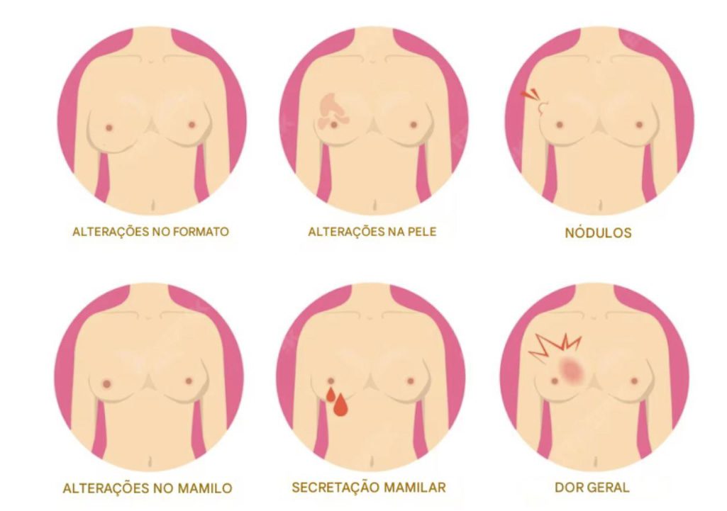 Alterações na aparência da mama, como mudanças no tamanho ou formato, são frequentemente os primeiros indícios. A pele pode apresentar vermelhidão, inchaço ou textura semelhante à casca de laranja. Caroços ou espessamentos na mama ou na região das axilas também devem ser investigados.