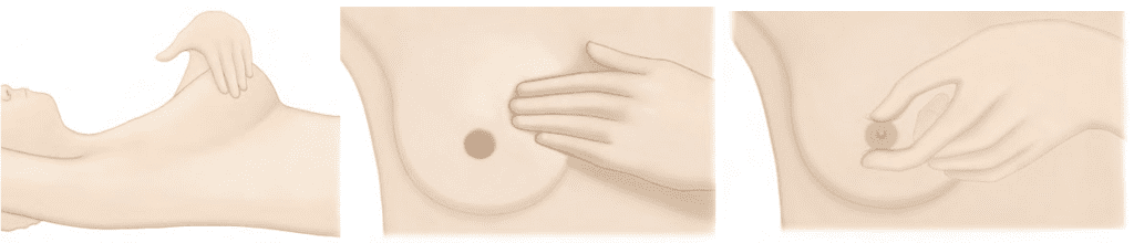 Deitada na cama: Coloque um pequeno travesseiro sob o ombro direito e a mão direita atrás da cabeça. Com a ponta dos três dedos médios da mão esquerda, faça movimentos circulares firmes, para sentir se há algum caroço ou espessamento na mama direita. Examine primeiro a axila, depois toda a mama em círculos do lado externo para o interno, e finalmente a região do mamilo. Aperte suavemente o mamilo para ver se sai alguma secreção. Repita o mesmo processo para a mama esquerda.